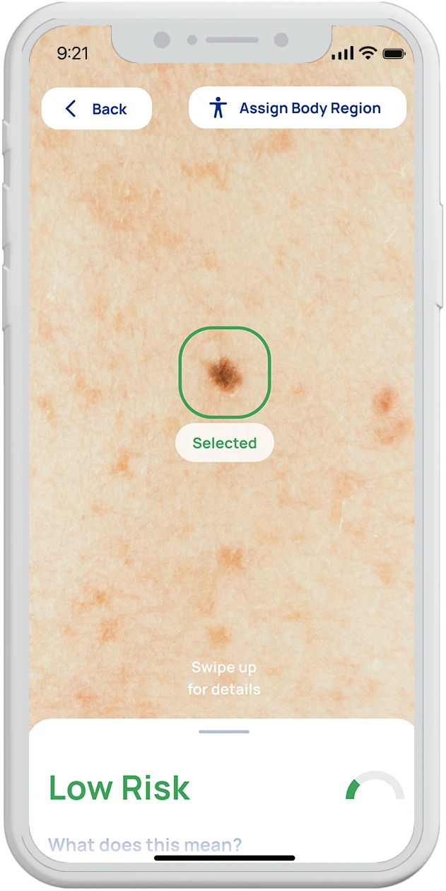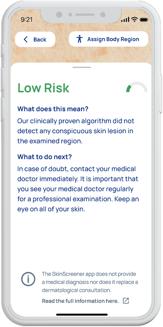 You’ll receive an assessment of the skin spot's characteristics. The result is shown as a risk level — low, medium, or high — based on the AI's evaluation. If needed, you will be advised to consider consulting a healthcare professional.